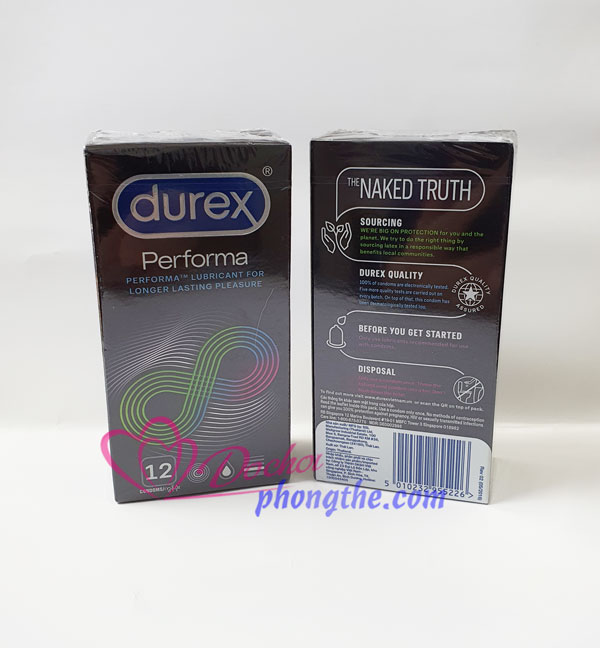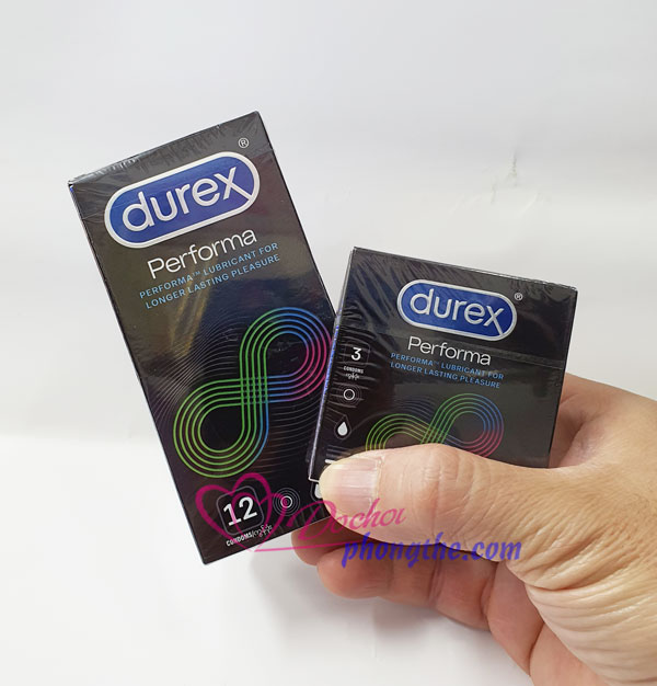 - Bao cao su Durex Performa có chất Benzoncanein 5% giúp chống xuất tinh sớm kéo dài thời gian quan hệ tình dục .Sản phẩm này mang lại hưng phần mãnh liệt chưa từng có cho cả nam và nữ.