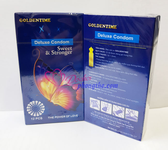 - Bao cao su gai Goldentime là sản phẩm được yêu thích của các cặp vợ chồng với giá thành phải chăng phù hợp với kinh tế gia đình. Từ khi ra mắt thị trường, sản phẩm đã làm khuấy đảo và tạo nên cơn sốt thực sự khiến các cặp vợ chồng trở nên viên mãn hơn trong đời sống chăn gối. Hòa quyện với hương dâu thanh mát lan tỏa là các hạt gai nổi li ti cọ xát lên thành âm đạo làm tăng cảm hứng gấp đôi.