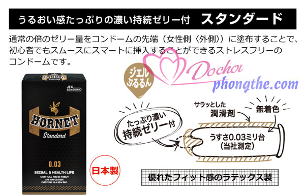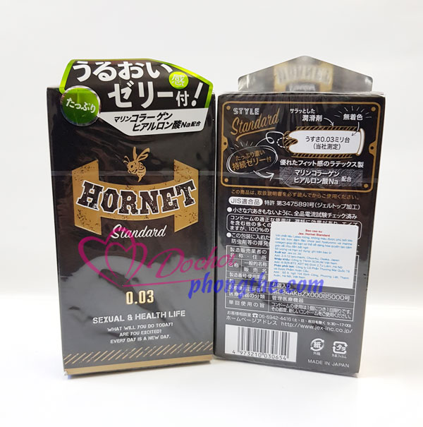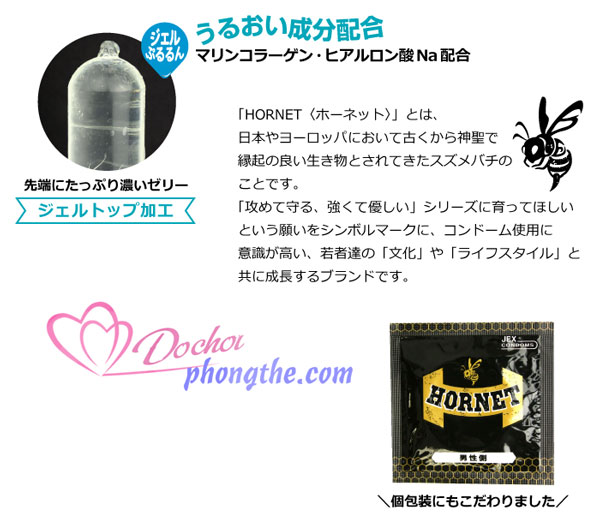 - Bao cao su Jex Hornet Standard 003mm là sản phẩm cao cấp của hãng Jex Condoms – một trong những công ty sản xuất và phân phối dụng cụ hỗ trợ tình dục hàng đầu Nhật Bản. Với thiết kế siêu mỏng đầy ấn tượng cùng kiểu dáng hiện đại, tiện dụng được ưa chuộng, Jex Hornet Standard 003 của Jex là sự lựa chọn số 1 của nhiều cặp đôi để duy trì lửa yêu trong suốt những năm tháng hạnh phúc.