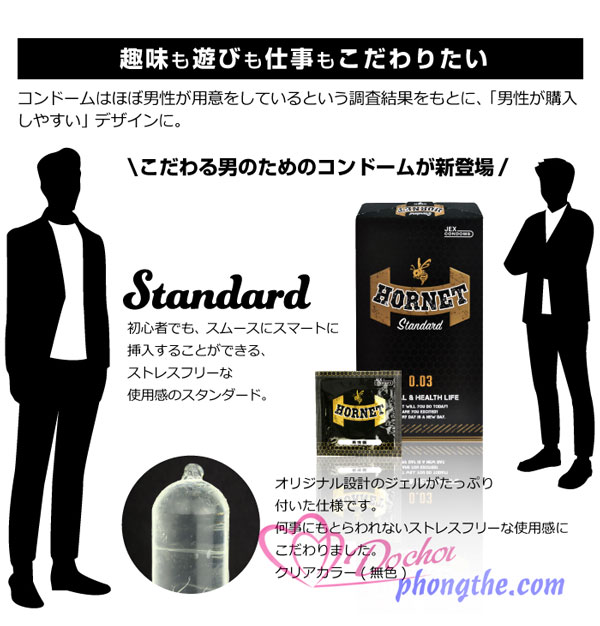 Bao cao su siêu mỏng siêu trơn Jex Hornet Standard 003 - Nhật Bản. Đầy ấn tượng cùng kiểu dáng hiện đại, tiện dụng được ưa chuộng số 1