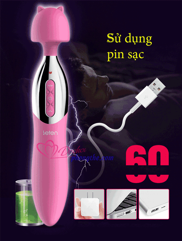 - Chày rung kèm lưỡi liếm Leten được thiết kế với phần đầu ngộ nghĩnh kiểu tai mèo nhằm mát xa toàn thân như vai, cố, gáy, bụng, âm đạo... Phần lưỡi rung bên dưới thích hợp cho việc mát xa âm vật, ngực hay âm đạo thì thật sự khiến các nàng sung sướng. Chất liệu silicone mềm mại giúp việc chà miết trở lên kích thích và rạo rực hơn. Cảm giác thích thú khiến chị em dâng trào cảm xúc khoái cảm.