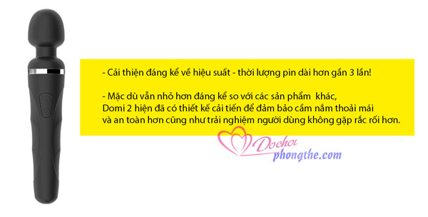 - Động cơ hiện đại lớn cho phép chày rung DOMI 2 rung cực mạnh, với nhiều tần số, chế độ rung khác nhau. Bạn sẽ khó mà tìm thấy một sextoys nào sở hữu công suất lớn đến vậy. Tin chắc rằng không một cô nàng nào có thể nằm im, lãnh cảm. Với vài phút tự xử thôi là giật tung người, run bần bật theo từng nhịp điệu, nước bắn tung tóe. Đặc biệt nữa là chày rung chạy cực kỳ êm, không gây ồn không gian xung quanh. Đây đúng là người tình bí mật mỗi đêm.