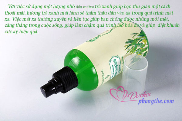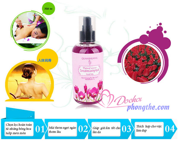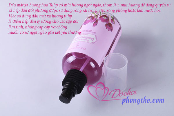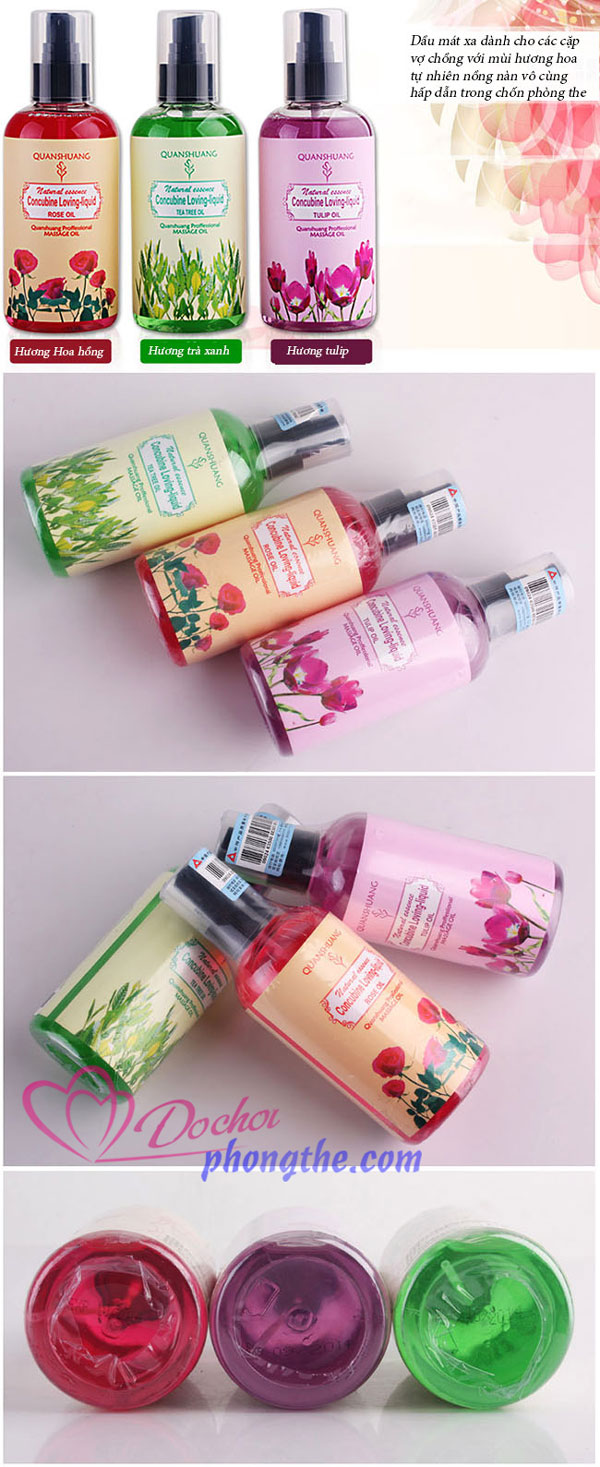 - Dầu mát xa body toàn thân 18+ hương hoa tự nhiên quyến rũ với tinh chất thiên nhiên trong lành, dịu nhẹ dễ dàng lôi cuốn và hấp dẫn. Đặc biệt các nhà sáng chế đã cho ra đời dòng mát xa với ba mùi hương quyến rũ ngây ngất, hương trà xanh mát lành, hương Tulip ngọt ngào và hương hoa hồng quyến rũ. Mỗi một mùi hương là một sự lôi cuốn khác nhau tùy vào sở thích của từng người để bạn có thể lựa chọn cho mình để tăng hiệu quả kích thích và ham muốn hơn.