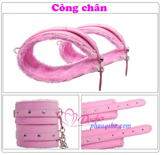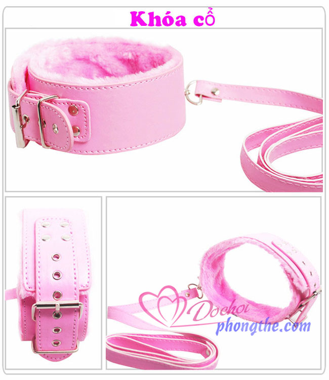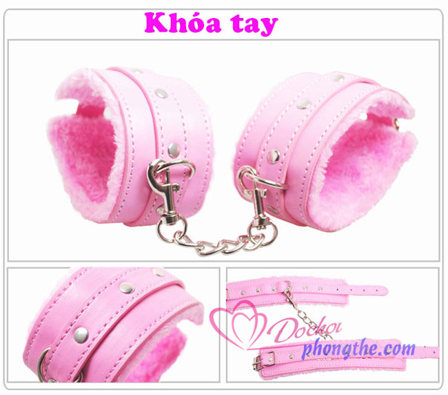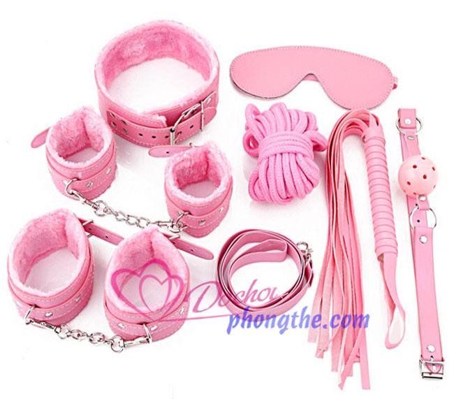 Bộ đồ chơi tình dục bạo dâm màu hồng có 7 món độc lạ: Roi da nhẹ nhàng, khóa hàm, bịt mắt, khóa tay, khóa chân, khóa cổ, dây trói tình yêu