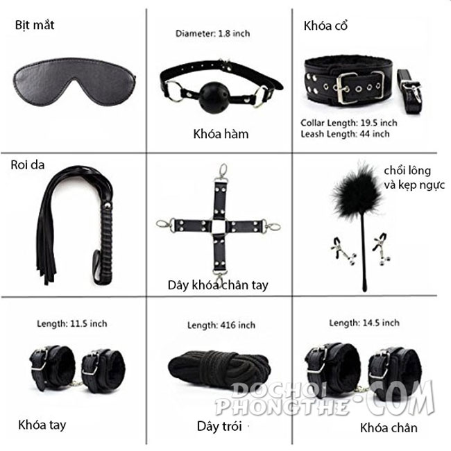 - Dụng cụ hỗ trợ tình dục bạo dâm gồm 1 bộ 10 món khác nhau sử dụng trong quan hệ tình dục dùng để định vị chân, tay, cổ , mông như dụng cụ còng tay, còng chân, bịt mắt, dây thừng, cây roi... đó là 10 sản phẩm như trên hình ảnh được chụp từ sản phẩm .