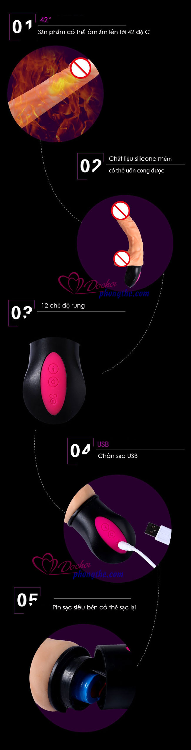 - Dương vật giả cầm tay siêu rung, sưởi ấm, mềm mịn như thật với kích thước đạt chuẩn của một người đàn ông trưởng thành, cộng với độ mềm mại có thể uốn thoải mái nên anh chàng rất được lòng các chị em. Tính chất siêu rung với công suất làm việc tối đa, thực hiện liên tục tới 12 tần số rung đảm bảo kích thích siêu sướng liên hồi, khi anh chàng đi sâu và len lỏi vào cửa mình. Những luồng sóng tình rung lên bần bật, liên tục khi anh chàng thúc mạnh hơn nữa vào trong âm đạo sẽ cực kỳ kích thích và khiến "cô bé" của chị em gần như phải gào thét vì quá sung sướng khi đạt đỉnh trong khi làm tình.