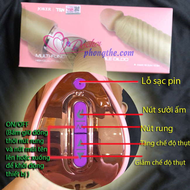 - Ngoài điểm nhấn thiết kế của dương vật giả đa năng Joker TSN là đẹp mắt, giống thật thì chức năng của anh chàng này nổi trội với phần da silicone có thể sục lên xuống giống như bao quy đầu. Cảm giác giống thật hơn hẳn so với những cây rung thụt đa năng có phần nhíp tạo điểm nhấn là lên xuống khác. Nó còn có thể giống thật hơn với nút điều chỉnh thân nhiệt làm ấm lên tới 42 độ C, khiến các nàng cảm giác râm ran nơi âm đạo, nó cũng chính là chất xúc tác khiến "cuộc yêu" của các nàng trở lên hoàn hảo và thỏa mãn hơn. Cảm giác ấm áp trong mùa đông giá lạnh được thay thế hoàn toàn khi các nàng sở hữu bên mình cu giả silicon Joker siêu mềm rung thụt sưởi ấm giống như một người tình lý tưởng.