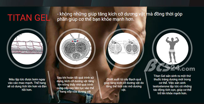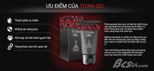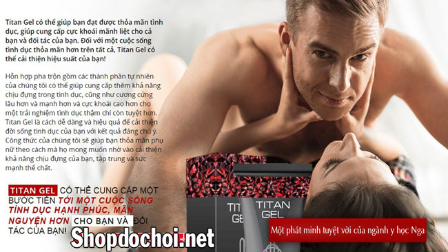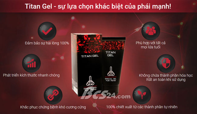 - Gel Titan Nga giúp tăng kích thước dương vật là dòng sản phẩm cao cấp xuất xứ từ Nga. Với công thức đặc biệt an toàn và ưu điểm không gây tác dụng phụ, dòng gel bôi giúp tăng kích thước cậu nhỏ một cách thần kỳ và hiệu quả nhất nhì trên thị trường hiện nay.