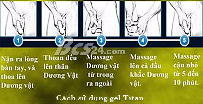 - Chỉ cần một lượng gel vừa đủ thoa đều khắp dương vật và tiến hành massge hàng ngày, việc làm này giúp cho việc lưu thông, tuần hoàn máu tốt hơn, kích thích thể hang dương vật nở rộng hơn từ đó tăng kích thước dương vật cũng trở lên dễ dàng hơn rất nhiều. Điều quan trọng là bạn cần phải kiên trì và massge hàng ngày với Gel Titan Nga để cải thiện "vóc dáng" cậu nhỏ trở lên săn chắc, to khỏe và cường tráng hơn.