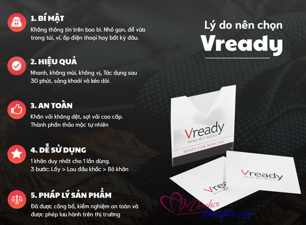 - Khăn chống xuất tinh sớm Vready V2Joy là sản phẩm giúp kiểm soát tình trạng xuất tinh sớm. Bằng cách sử dụng công nghệ chuyển giao thẩm thấu nhanh vào da mang tới sự an toàn cũng như kéo dài thời gian quan hệ lên gấp nhiều lần. Thiết kế của sản phẩm nhỏ nhắn, độc đáo như một chiếc danh thiếp giúp các quý ông có thể dễ dàng bỏ vào trong ví và mang tới bất cứ nơi đâu.