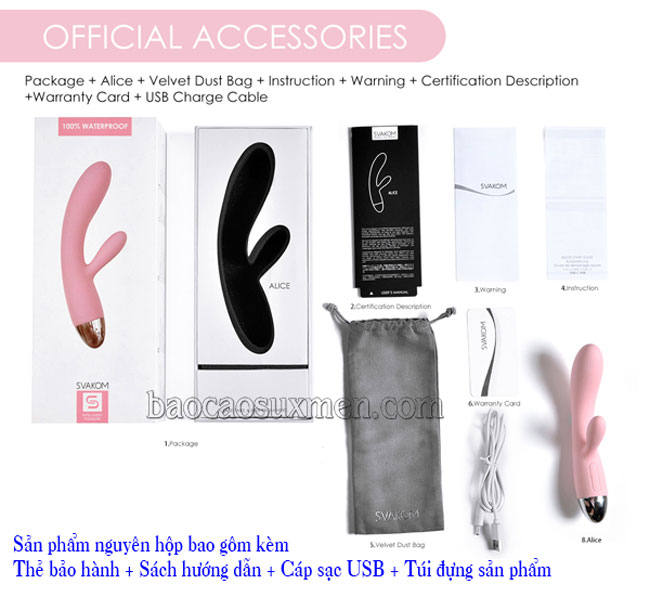 - Máy massage âm đạo cao cấp Svakom Alice là loại đồ chơi tình dục dành cho nữ cao cấp sản phẩm được sản xuất từ 100% nhựa y tế ABS cao cấp và được phủ lớp siliagel y tế mềm mại an toàn tuyệt đối cho người sử dụng. Với kiểu dáng thiết kế sang trọng đẹp mắt mang lại cho chị em sự thân thiện khi sử dụng đặc biệt sản phẩm đã được kiểm định bởi bộ y tế Hoa Kỳ đủ tiêu chuẩn và an toàn tuyệt đối trên toàn thế giới .