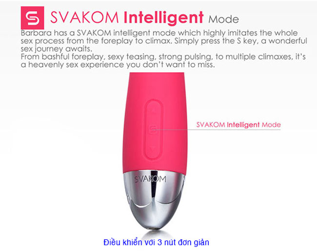 - Đồ chơi tình dục Svakom Barbara có thiết kế 3 phím nhỏ gọn trên thân giúp bạn dễ dàng điều chỉnh 8 chế độ đam mê và tùy chỉnh tốc độ rung như ý để mọi cuộc yêu đều hoàn hảo.