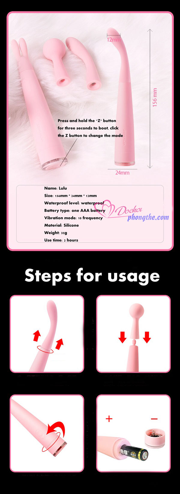 - Điểm ưu nữa của sản phẩm là rung rất êm, khả năng gây ồn là không có. Lulu được sử dụng 1 pin AAA rất tiện lợi và dễ dàng tháo lắp. Sản phẩm được thiết kế chống thấm nước nên các bạn có thể sử dụng Lulu dưới vòi sen hay bồn tắm, 1 cảm giác cũng rất mới lạ và thú vị.