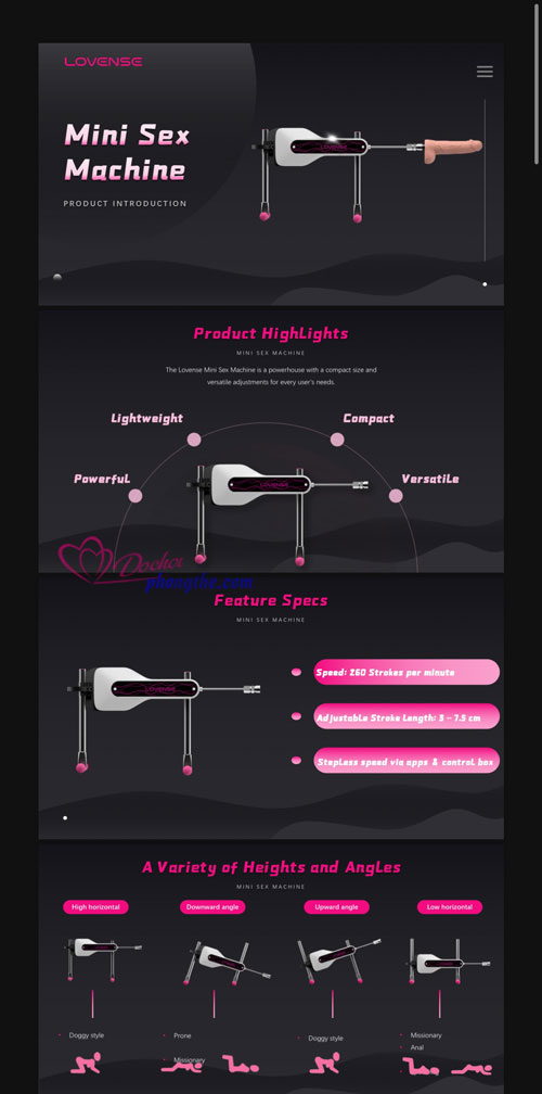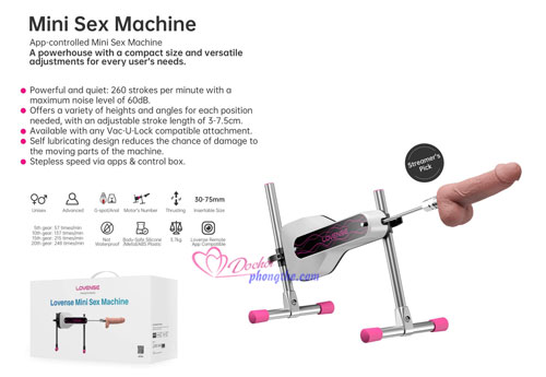 - Máy thủ dâm tự động 1 đầu Lovense Sex Mini Machine là phiên bản cao cấp thu nhỏ của dòng máy làm tình 2 đầu thế hệ trước của Lovense nhằm giúp chị em phụ nữ thỏa mãn nhu cầu sinh lý một cách dễ dàng. Tuy dòng máy Mini này chỉ có một đầu nhưng các công năng của nó không thua kém gì loại máy 2 đầu trước đó. Dương vật giả giống thật đi kèm của máy làm tình lại có kích thước to hơn cậu nhỏ trung bình của đàn ông Châu Á nên chị em nào thích khoai to sẽ cảm thấy thỏa mãn khi thủ dâm ở âm đạo hoặc hậu môn.