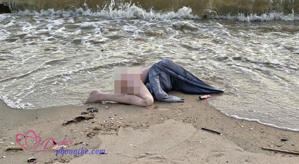 Nhóm du khách rất hoảng sợ khi phát hiện thấy một "thi thể" không mảnh vải che thân nằm trên bãi biển Bang Saen ở tỉnh Chonburi, phía đông Thái Lan, hôm 18/8. Phần trên của "thi thể" được che lại bằng chiếc áo sơ mi.