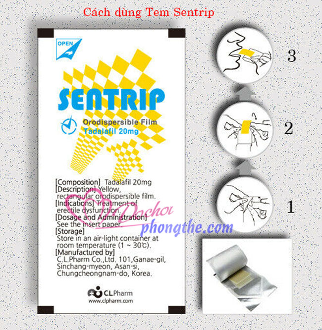 - Tem ngậm Sentrip được các bác sĩ Hàn Quốc khuyên dùng hỗ trợ điều trị rối loạn cương dương. Có tác dụng tăng cường sức mạnh cho “cậu nhỏ”. Ngậm 3 giây dưới lưỡi vào 30 đên 60 phút trước khi “lâm trận” sẽ giúp bạn “chiến đấu bền bỉ đến giọt cuối cùng”. Rạo rực khí thế, hừng hực đê mê, không gì ngăn trở bạn và nàng bên nhau bền bỉ. Hiệu quả kéo dài cực lâu, chỉ có tác dụng những khi “lâm trận”.