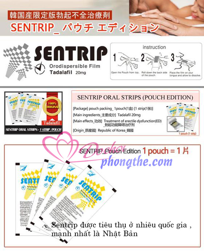 - Tem ngậm Sentrip Hàn Quốc được bào chế từ TDLP với cơ chế tác động giúp cương cứng một cách tự nhiên như phản xạ thông thường trong sinh hoạt tình dục. Không gây ra hiện tượng kích dục đột ngột khiến cơ thể mệt mỏi, tim đập nhanh như các sản phẩm thông thường. TDLP thẩm thấu vào cơ thể khi có các tác động về tình dục sẽ bắt đầu có tác dụng.