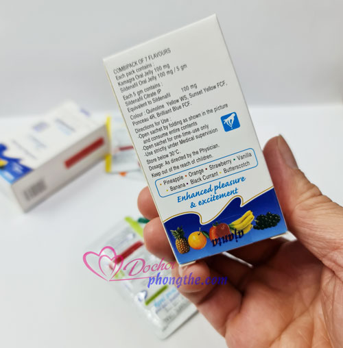 - Thành phần: Bào chế dạng thạch thành phầm chính Sildenafil 100mg kết hợp với các mùi hương trái cây rât hấp dẫn