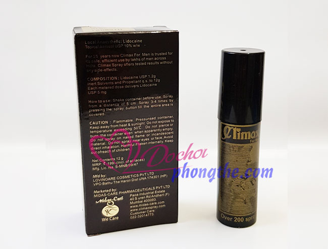 - Climax chai xịt chống xuất tinh sớm của Ấn độ sử dụng chất gây tê cục bộ ở phần đầu dương vật nam giới, giúp ngăn ngừa việc xuất tinh sớm cho các anh bền bỉ và dẻo dai gấp nhiều lần so với hiện tại. Chai xịt với thành phần hoàn toàn từ thảo dược lành tính, không gây tác dụng phụ hay kích ứng lên phần biểu bì của dương vật cho các anh cảm giác thoải mái khi quan hệ. Chai xịt chống xuất tinh sớm thiết kế khá nhỏ gọn với trọng lượng đóng chai 12ml vô cùng tiện lợi cho anh em có thể bỏ túi mang đi bất cứ đâu để có thể chinh phục bạn tình.
