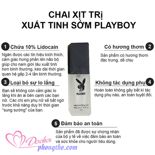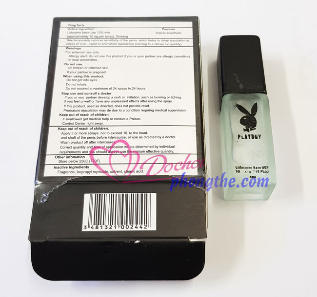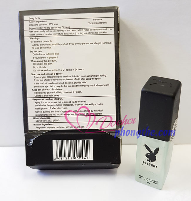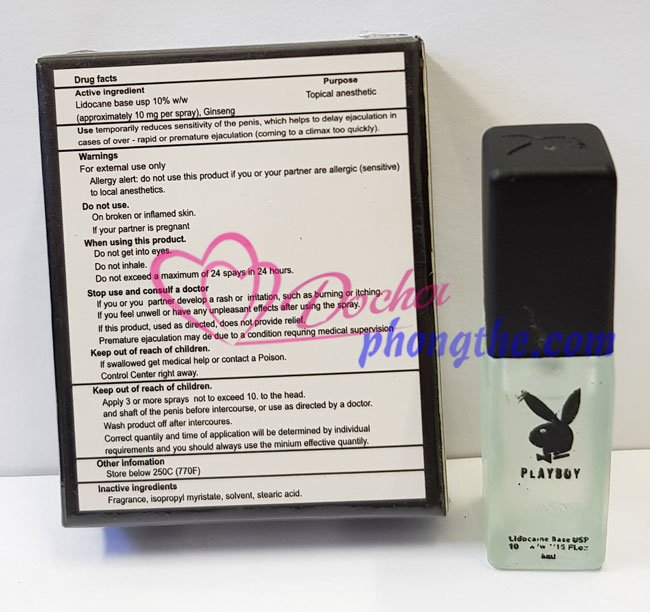 - Thuốc xịt chống xuất tinh sớm Playboy dạng xịt phun sương có chứa 10% Lidocanin chất gây tê cục bộ, khi xịt lên dương vật sẽ làm tê bên ngoài lớp biểu bì, nhờ đó ngăn tín hiệu kích thích lên não giúp làm chậm quá trình xuất tinh của nam giới , kéo dài thời gian quan hệ tình dục, hiệu quả tức thì 5 phút sau khi xịt, khi mới xịt sẽ cảm thấy nóng ở đầu dương vật sau khi thuốc ngấm sẽ hết nóng.