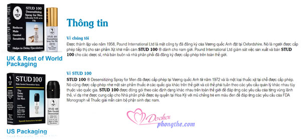 - Chai xịt Stud 100 UK đang được xem như một “cứu cánh” tuyệt vời của nam giới khi giúp nhiều đáng mày râu thể hiện bản lĩnh đàn ông trước bạn tình. Những vấn đề xuất tinh sớm tế nhị, nhạy cảm liên quan đến sinh lý nam dường như không còn là vấn đề kể từ khi dòng sản phẩm đặc biệt này xuất hiện.