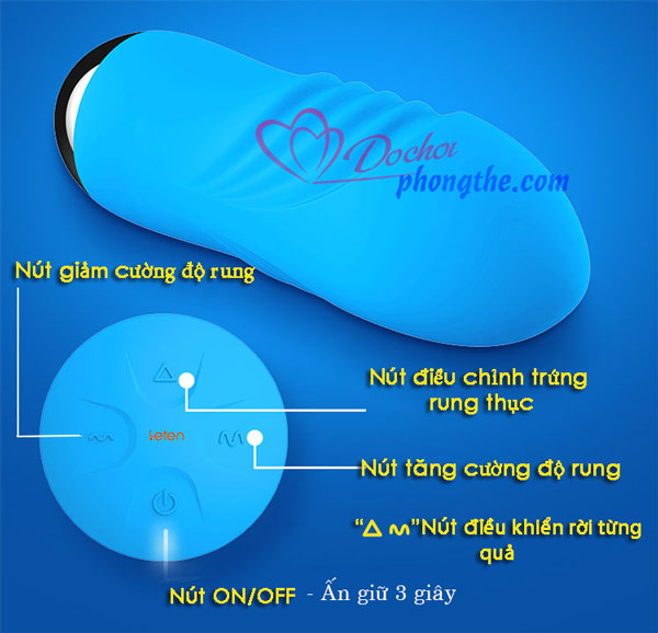 - Trong quá trình sử dụng bấm giữ nút ON/OFF trong vòng 3 giây đèn LED sáng đồng thời trứng rung mềm hoạt động theo. Bấm tiếp nút tăng/ giảm cường độ để điều chỉnh trứng rung theo sở thích. Để khởi động trứng rung thục bấm tiếp nút mũi tên hình tam giác trứng bắt đầu hoạt động, bấm tiếp nút tăng giảm cường độ để điều chỉnh theo sở thích.