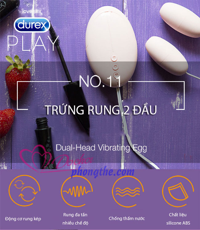 - Durex được biết đến với loại bao cao su nổi tiếng , nay có thêm các loại máy mát xa trứng rung tình yêu để làm cho cuộc sống tình dục thêm thăng hoa gấp bội , mà vẫn an toàn cho sức khỏe . Trứng rung tình yêu Durex Dual Head Vibration với thiết kế đơn giản mà tinh tế , đánh trúng tâm lí cũng như chạm tới ngưỡng khoái lạc cho ác cặp đôi , đặc biệt là nữ giới , sản phẩm với hai quả trứng rung , cho phép các bạn sử dụng trứng để kích thích 2 nơi , 2 vị trí khác nhau trên cơ thể cùng lúc , hoặc chỉ chỉ sử rung một quả theo sở thích riêng của mỗi người . Với chế độ rung tới 12 chế độ , điều khiển của sản phẩm sẽ như một người chỉ huy , giúp ra lệnh cho 2 bạn trứng rung cấp dưới hoạt động rung mát xa theo ý . Từ bên ngoài và tận bên trong , trứng rung đều có thể len lỏi vào và phát huy khả năng giải tỏa sinh lý cho nữ giới một cách hiệu quả .