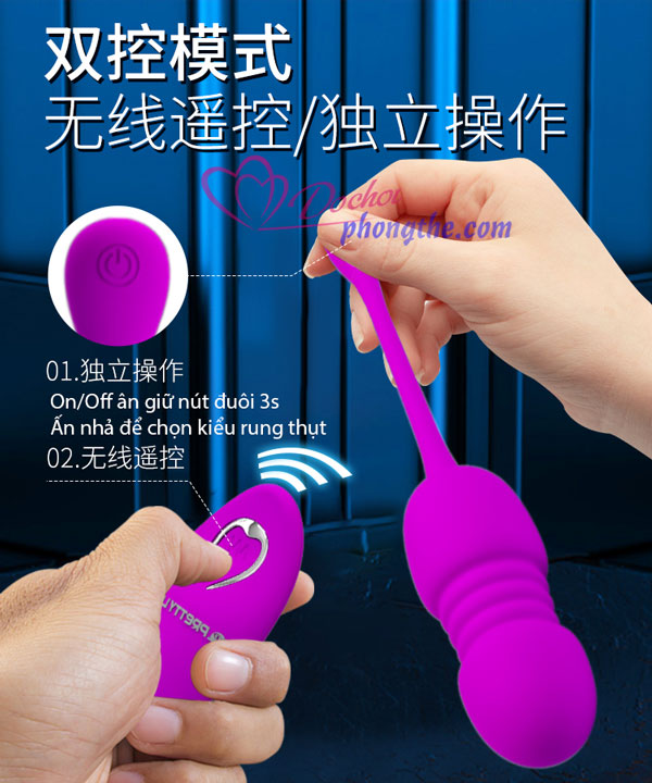 - Trứng rung thụt điều khiển từ xa Prettylove Callieri là dòng sản phẩm nhỏ gọn, tiện lợi nhưng đầy đủ chức năng cho các cặp đôi dạo đầu, remote điều khiển từ xa tiện lợi nên có thể dùng cho nữ đeo vào tự sướng ở nơi công cộng như chiếc quần lót rung thụt.