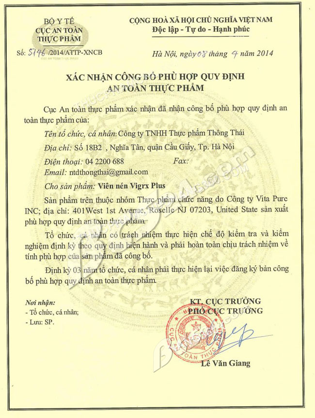 -- NK&PP : Công Ty TNHH Thực phẩm Thông Thái - Nghĩa Đô - Cầu Giấy - Hà Nội - Bộ Y Tế chứng nhận tiêu chuẩn: 5146/2014/ATTP - XNCB